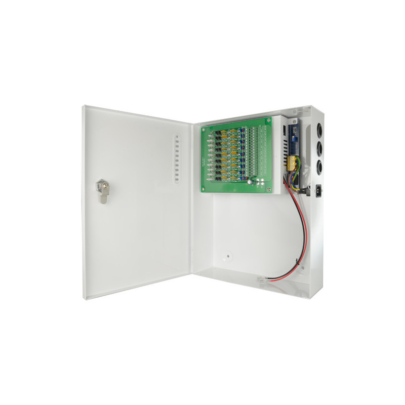 Il est utilisé pour alimenter plusieurs caméras ou d'autres dispositifs de sécurité à partir d'une source commune en ajoutant une protection individuelle. Il permet une alimentation continue tension jusqu'à 18 appareils. Possède une entrée d'alimentation au moyen de la prise de courant alternatif (AC 96 ~ 264 V) et 18 sorties d'alimentation continue, avec connecteur par bornier. Chaque sortie a une protection de fusible PTC avant la panne, un court-circuit, puis réinitialise, au lieu de fusion comme des fusibles conventionnels. De plus, il dispose d'une protection en face des courts-circuits et des pointes de tension.